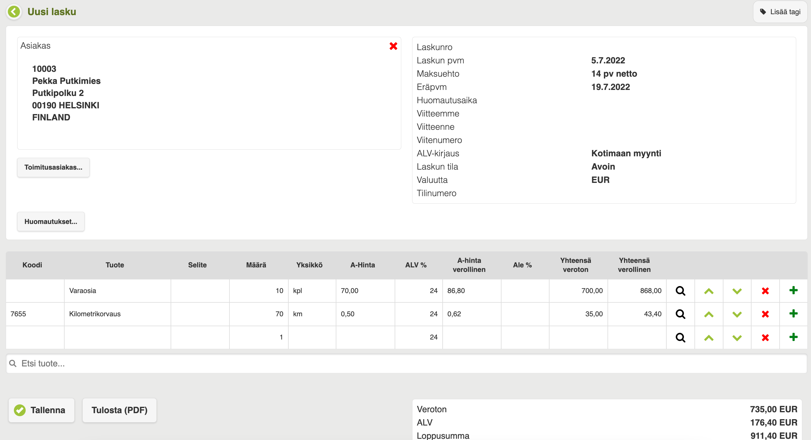 Kun laskutat asiakkaaltasi tuotteita ja palveluita, voit samalla tavoin laskuttaa myös matkakuluja. Kätevästi tämä käy laskutusohjelmalla. Esimerkiksi HelpostiLaskulla voit luoda uuden tuotteen, kuten kilometrikorvaus, ja lisätä sen tarvittaessa laskulle. Kun syötät ajetut kilometrit, ohjelma laskee veloitettavat kilometrit automaattisesti laskulle. Alla olevassa kuvassa näet esimerkkilaskun HelpostiLasku-laskutusohjelmasta.